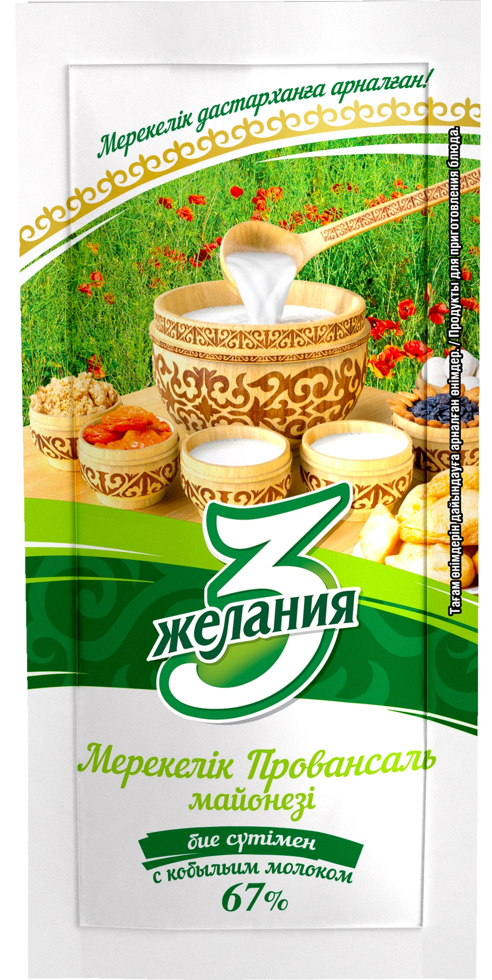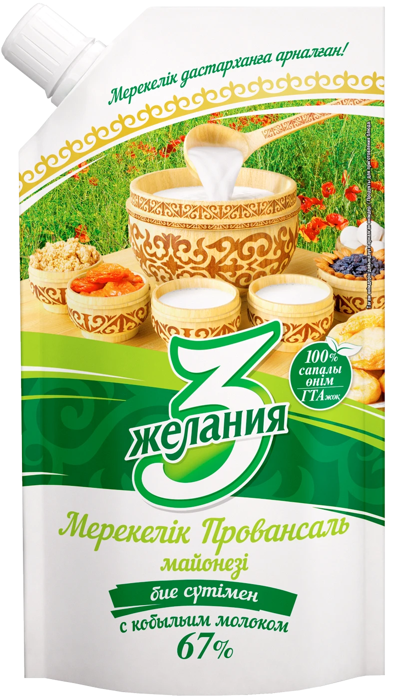 Жирность 67%. Первый в Казахстане майонез на кобыльем молоке! Создан с учетом национальных кулинарных традиций. Обладает нежным вкусом и мягкой консистенцией. Не содержит ГМО, красителей, крахмала, консервантов и ароматизаторов.