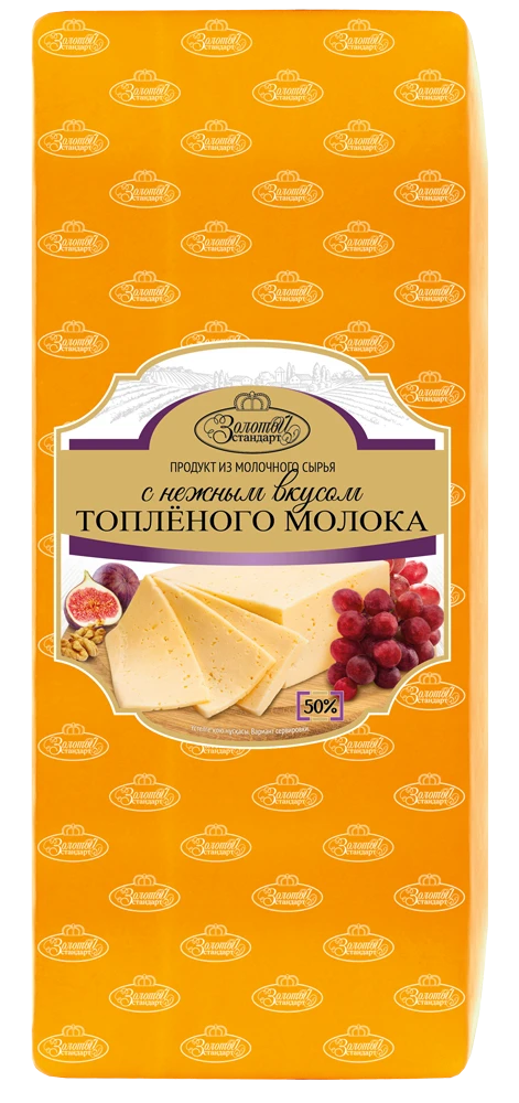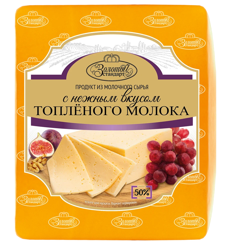 Жирность 50%. Продукт имеет приятный вкус и аромат топлёных сливок, на срезе красивый рисунок в виде «пористых» глазков различного размера. Подходит для приготовления любых бутербродов, пиццы и выпечки.